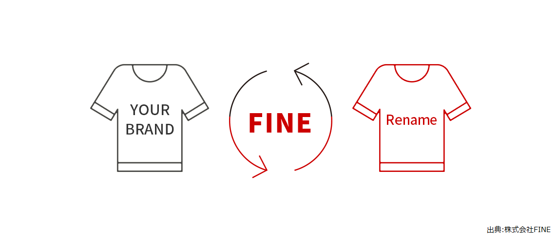 残ってしまった服のブランドタグを外して別の服「Rename」としてリセール(再販売)。運営会社は株式会社FINE(ファイン)。