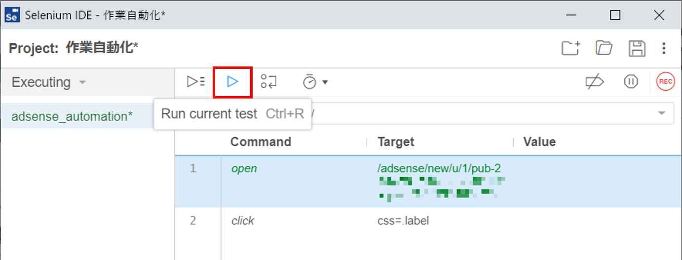 ページ表示後に「Selenium IDE is recoding」と表示され録画状態になるので、自動化したい作業を行ってください。何度も同じ行う場合は最初の1回のみで良いです。